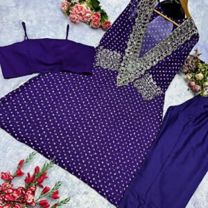 Lonching Beautiful Heavy quality Georgette Fabric designer wear Style Anarkali Style Side Cut Kurti with Crape fabric pant & paded bustier with Crap Lining & Full flowing pattern with Coded Embrodery & original mirror lace work on the side Edges of Sleeves & on Yoke