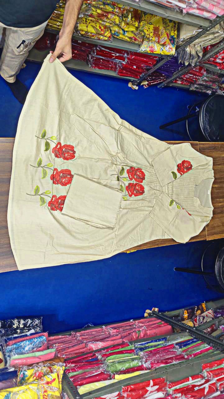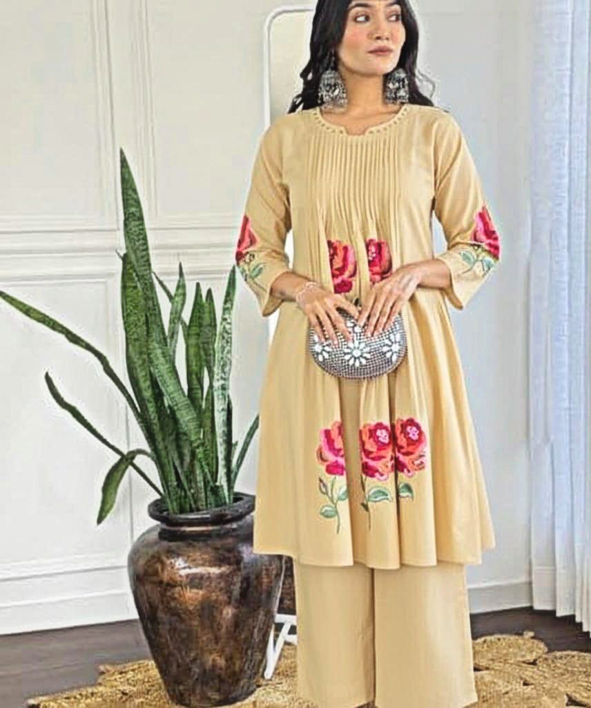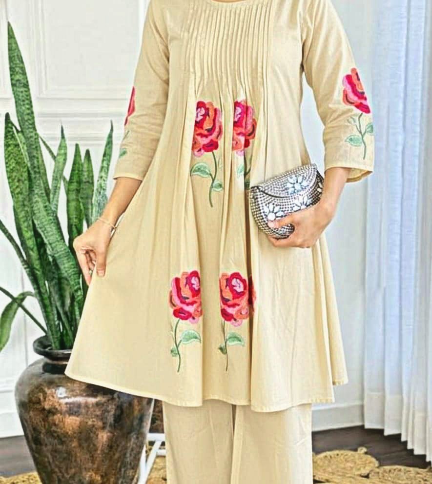 ❤Premium Cotton Coords, Kurta With Mirror Work And Beautiful Embroidery All Over,bPaired Up With Cotton Plazzo Pants
